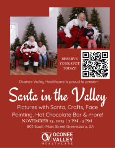 Join Oconee Valley Healthcare in a day full of holiday cheer on November 23, 2025! We will have pictures with Santa, face painting, hot chocolate bar, cookies, and crafts! Tickets start at $10 and can be bought at https://givebutter.com/santainthevalley25